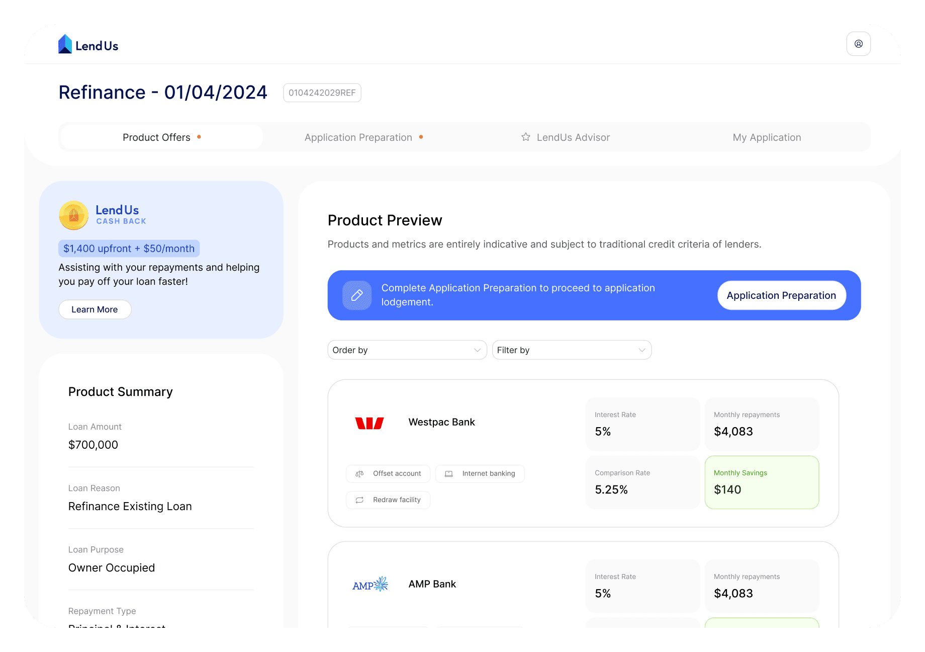 * This Offer is administered at LendUs’ sole discretion and may be varied or withdrawn at any time without notice. Eligibility is only for loans that have settled where LendUs has been paid commissions by the funding lender. Cash back amounts shown on this website, the LendUs platform, or in any marketing materials are based on two components: (1) an upfront cash back payment equal to 0.10% of the original loan balance (less any offset funds), and (2) a monthly cash back payment equal to 0.05% per annum of the outstanding loan balance (less any offset funds), calculated and paid monthly. For loans that reduce over time, the monthly cash back will reduce as the loan is repaid. While some figures may be shown as annualised amounts based on the original loan balance, actual cash back is based on the remaining loan balance at the time. Notwithstanding any loan settlement or ongoing cash back payments, LendUs reserves the right, at its sole discretion, to vary, suspend or cease any cash back payments at any time, including where a loan remains active.